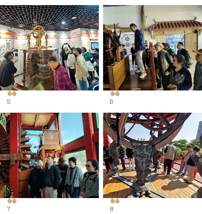 随后,讲解员带领大家移步苏颂公园,观摩按1:1比例复原的水运仪象台,大家小心有序地进入水运仪象台塔楼内,近距离地观看了一层的报时机构、二层的浑象和三层的浑仪。大家无不为一千多年前能有如此精妙绝伦的发明而惊叹不已。通过直观的现场体验,仿如一次穿越千年的对话,令人深切体会到中华民族对世界科技文明的深远贡献,自豪之情油然而生。有两位老师更是即兴赋诗,以寄情怀。