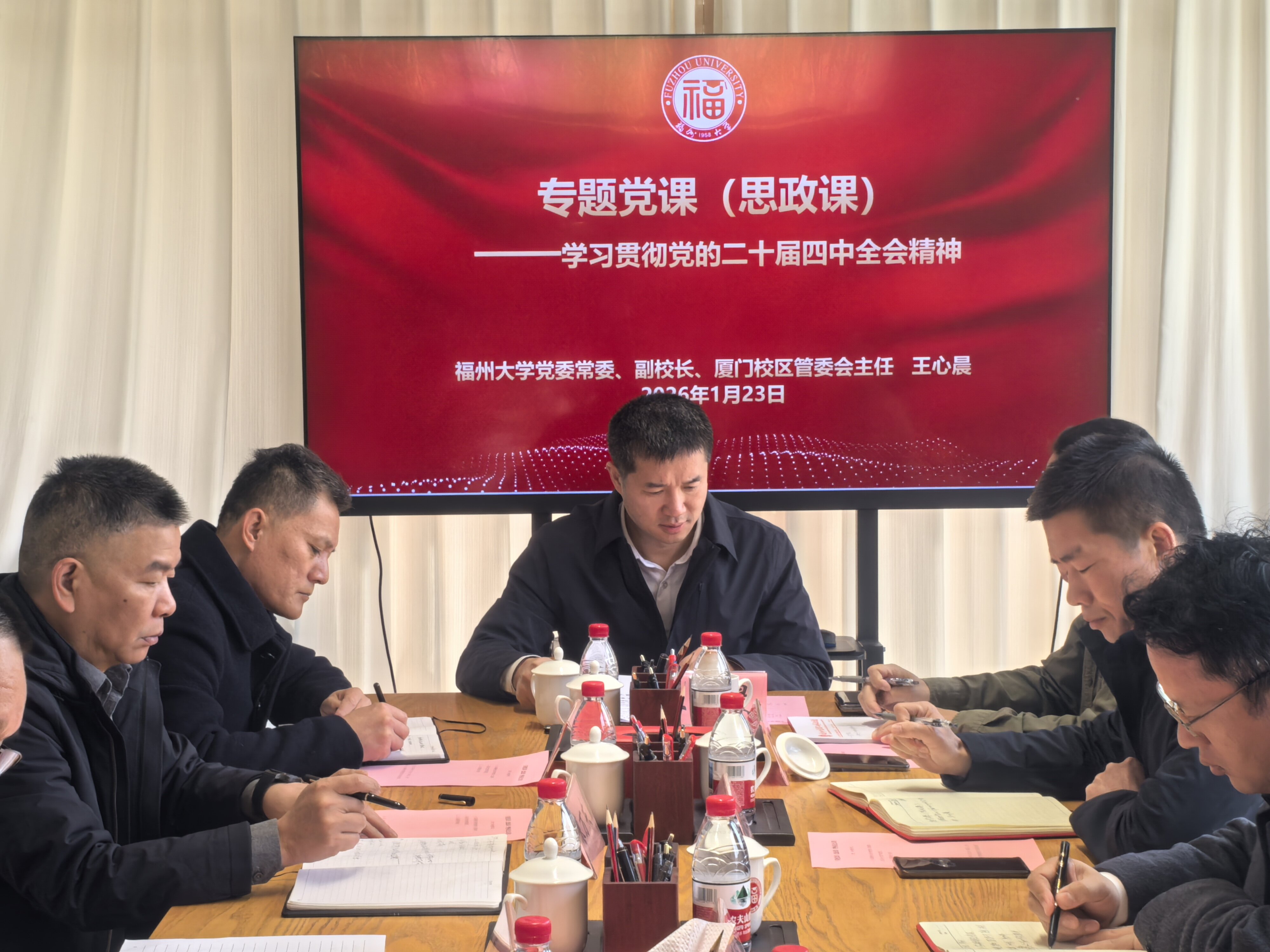 2026年1月23日上午,福州大学集美校区书瓦间会议室举行专题党课(思政课)学习会。校党委常委、副校长、厦门校区管委会主任王心晨讲授题为“学习贯彻党的二十届四中全会精神”的专题党课(思政课)。学院党委书记林金强主持会议。