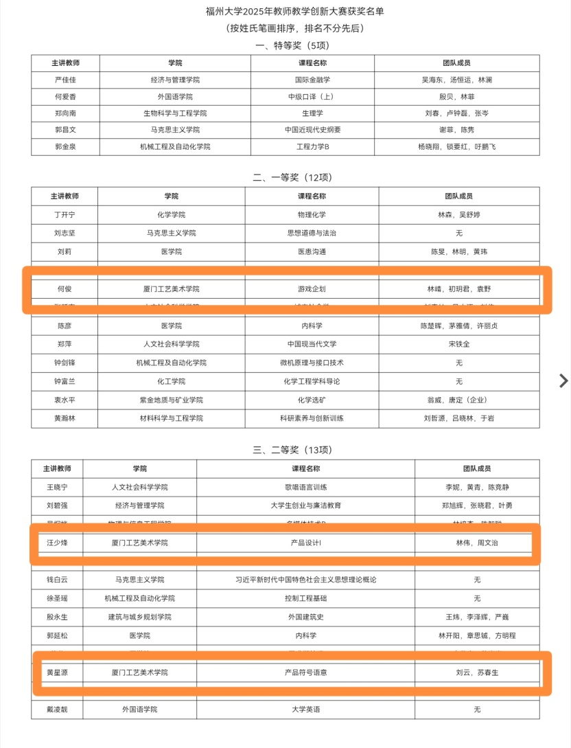 在福州大学2025年教师教学创新大赛中,我院参赛的教师取得了优异成绩。其中何俊老师(主讲课程名称:游戏企划)荣获一等奖,汪少烽老师(主讲课程名称:产品设计Ⅰ)和黄星源老师(主讲课程名称:产品符号语意)荣获二等奖。特向以上三位老师表示热烈的祝贺!